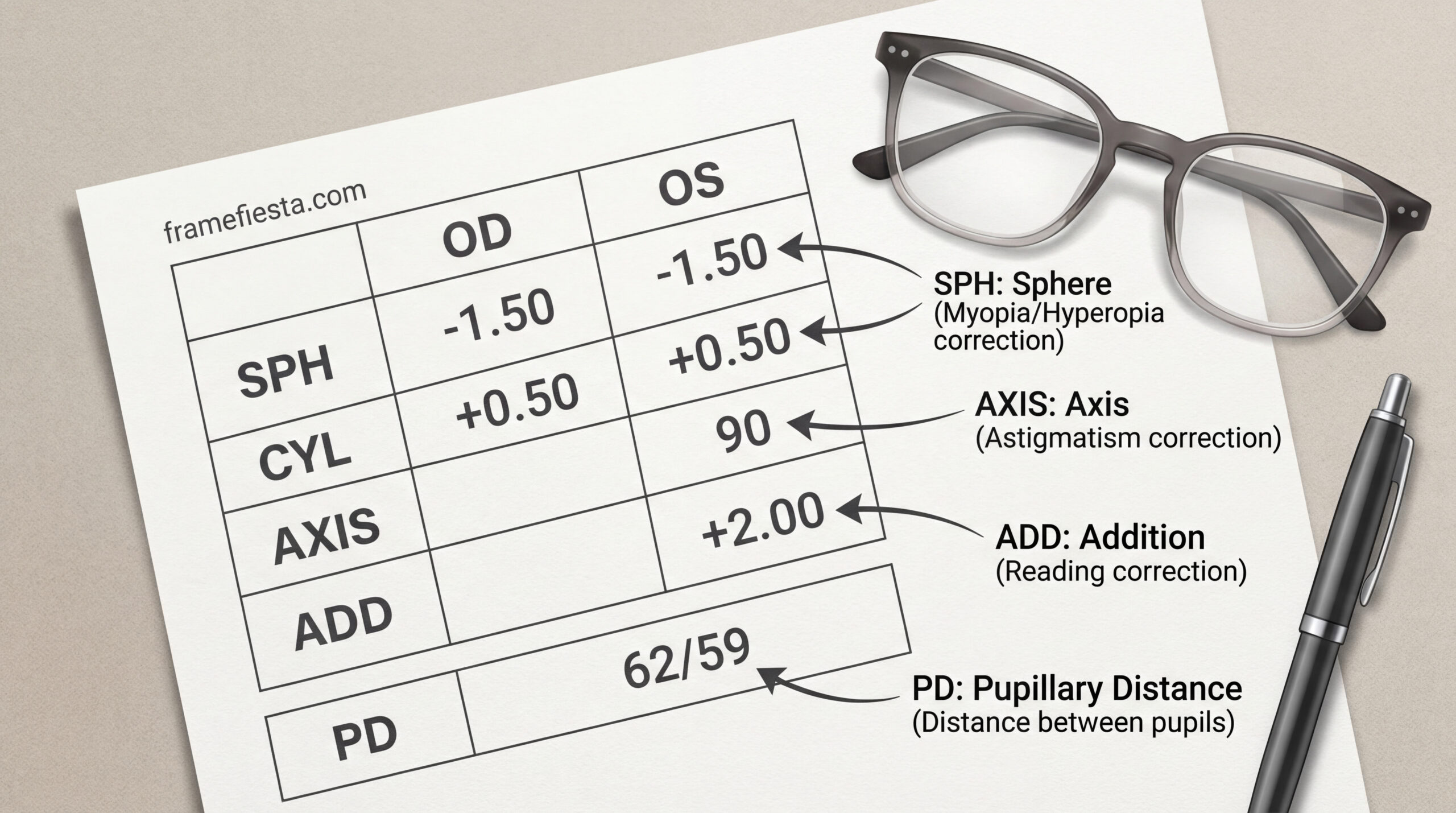 Start with OD and OS. SPH is your main strength, CYL and AXIS correct astigmatism, ADD is for near vision, and PD centers your lenses correctly.