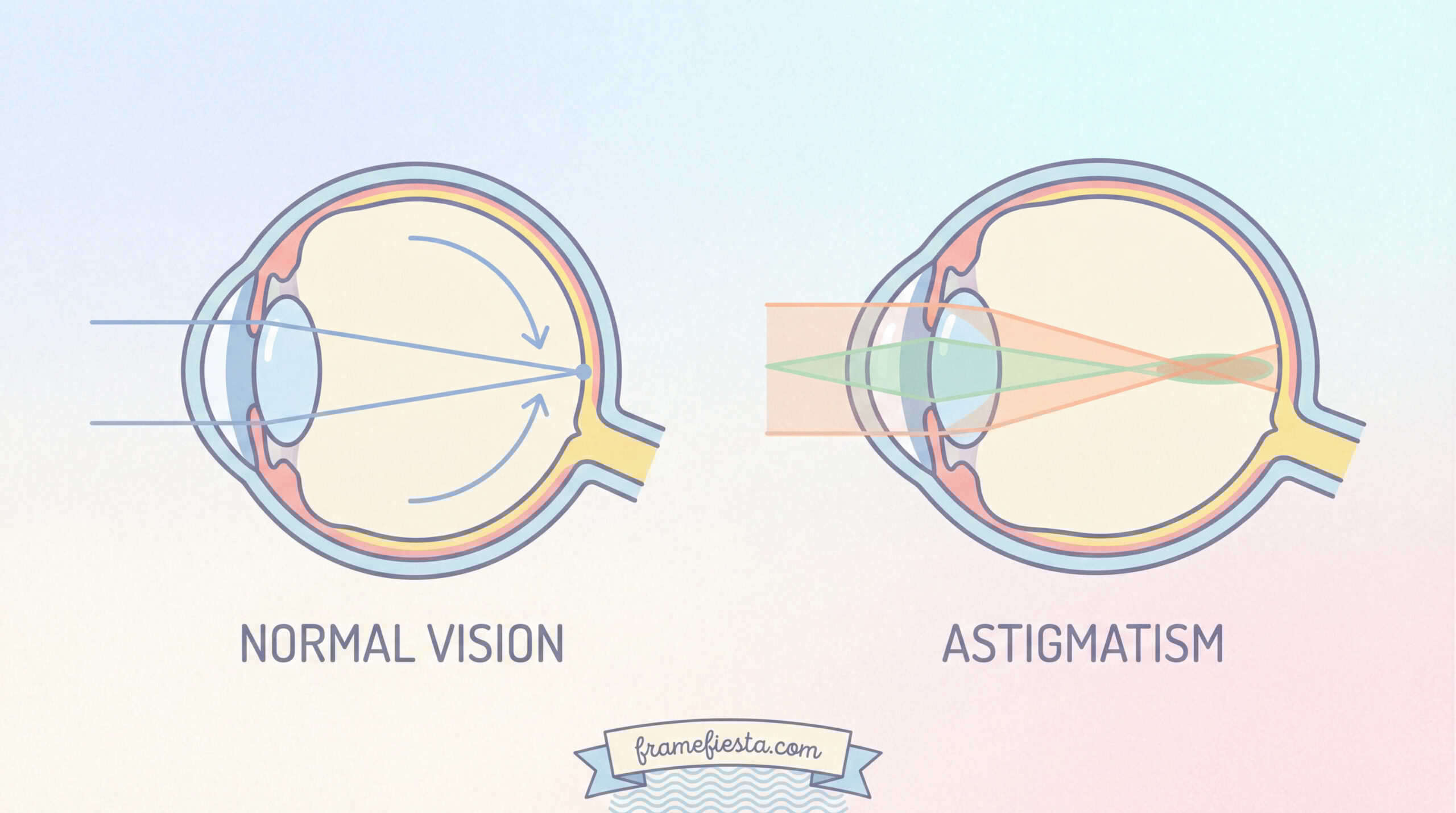 Astigmatism simply means the eye is not perfectly round. Instead of light focusing evenly, it bends differently in certain directions, which can cause blur or distortion.